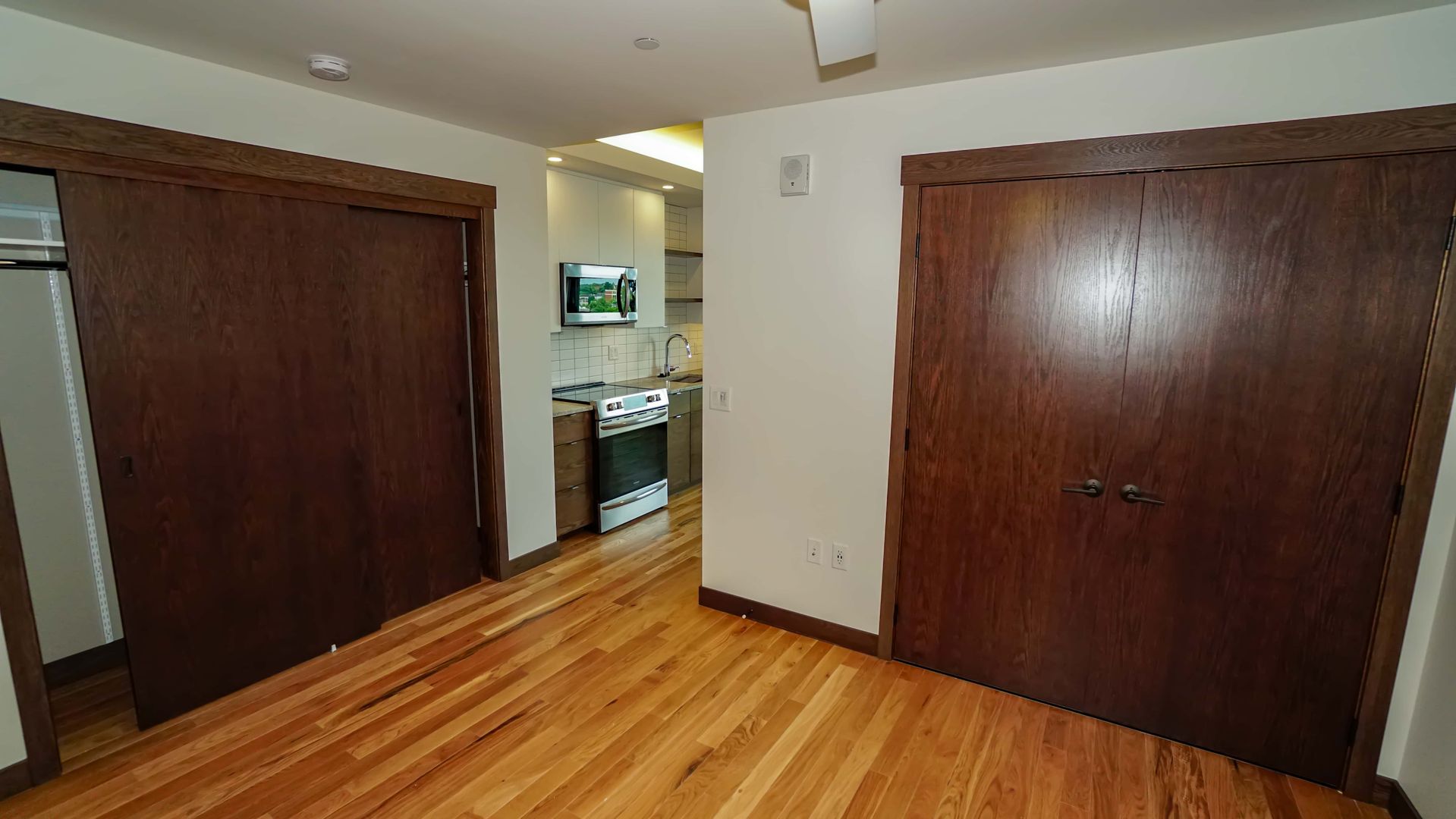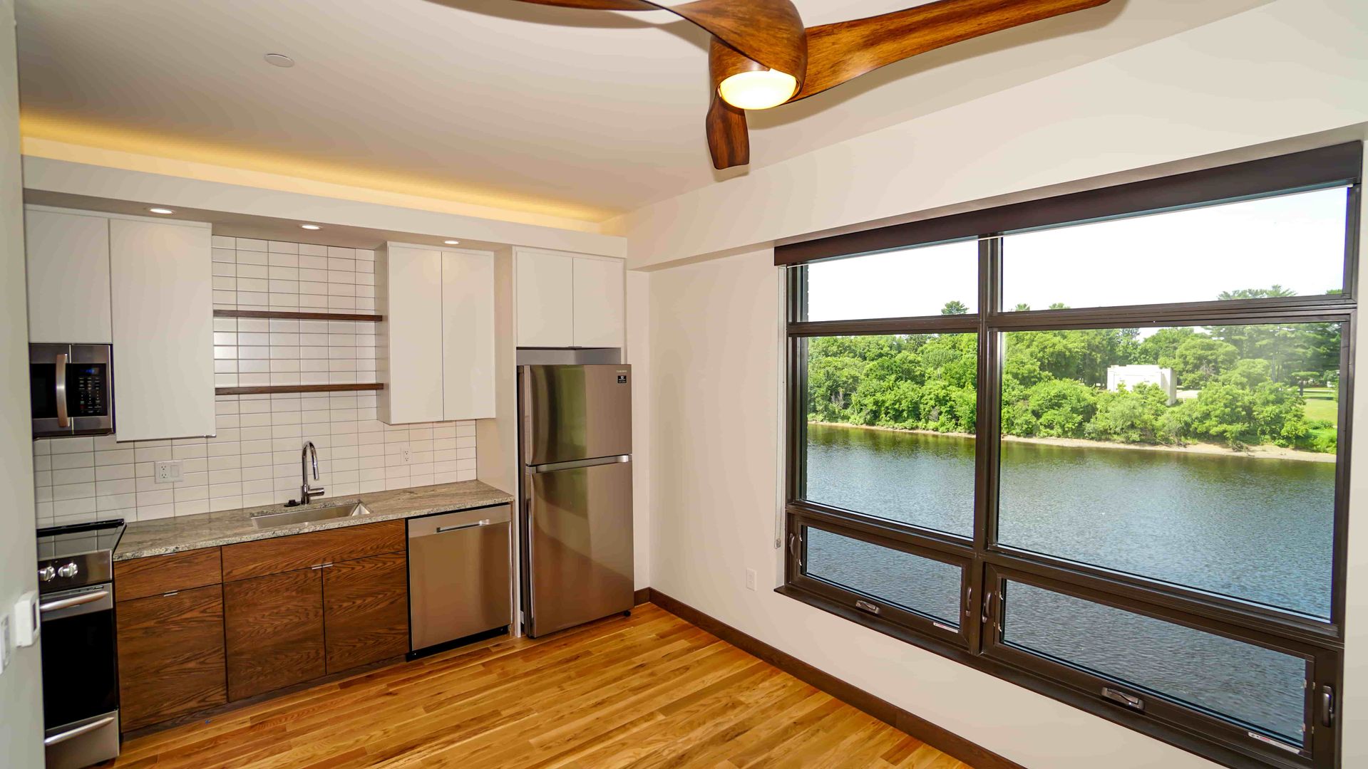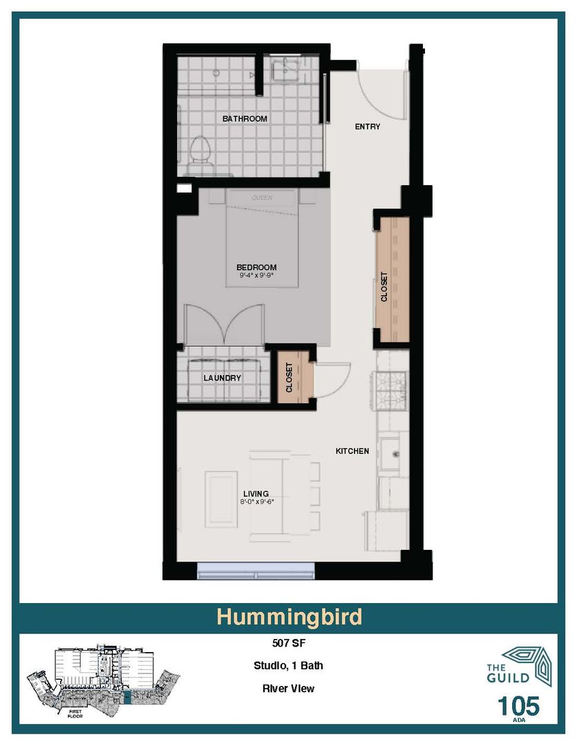 There are Hummingbirds on the first, second, and third floors. These charming studio apartments are 507 sq. ft. and have a designated bedroom area, one bathroom, a walk-in closet, living area, and in unit laundry. Hummingbird units provide views of the Chippewa River from the living area.