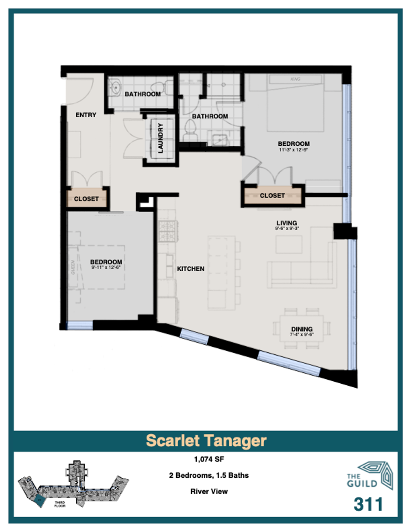 The Scarlet Tanager units on the second and third floors offer two bedrooms, a den, one and a half bathrooms, and a living area with stunning views of the Chippewa River.
