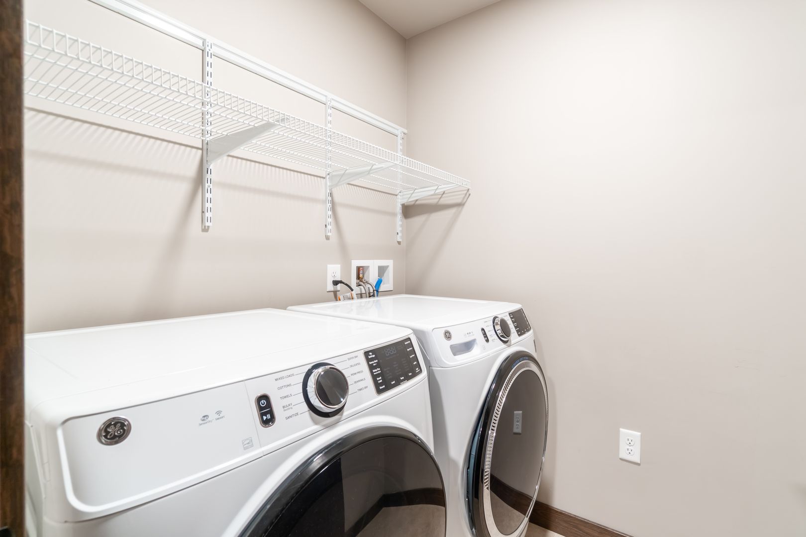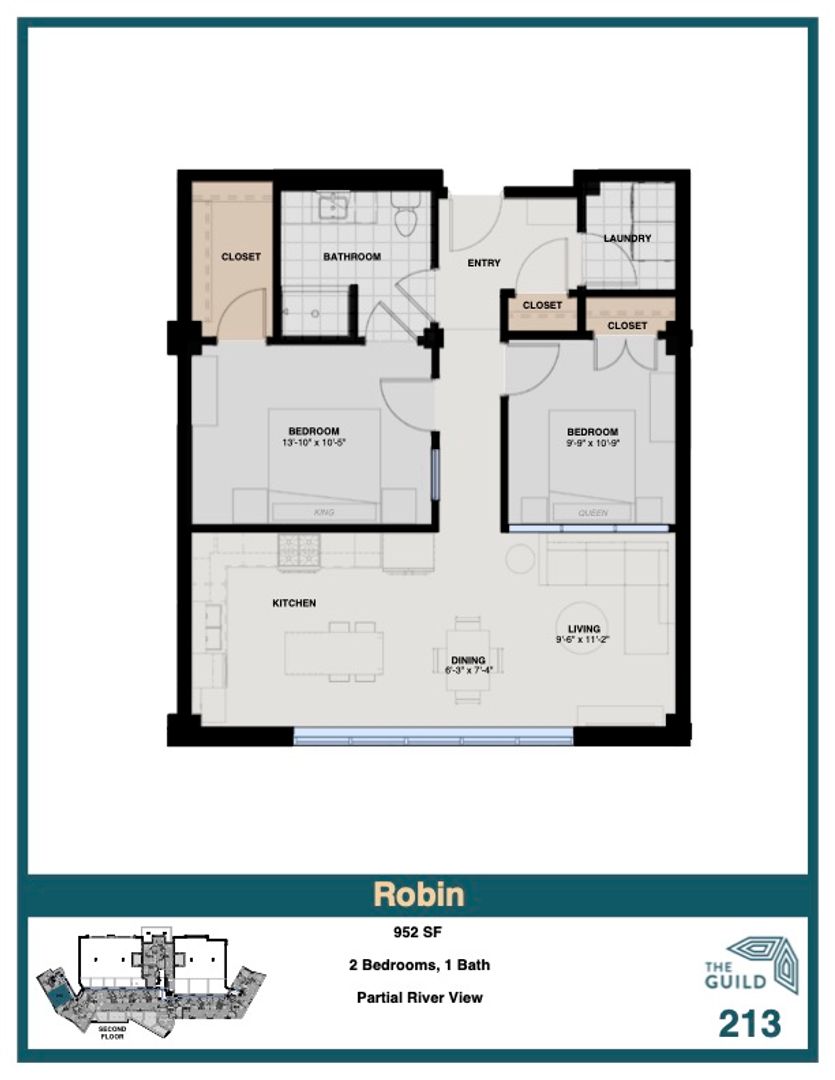 There are Robins on the first, second, and third floors. These are the most numerous type of unit in The Guild, with the 952 sq. footprint boasting two bedrooms, one bathroom, a walk-in closet, living area, and designated laundry area. All Robin units provide views of the Chippewa River from the living area.