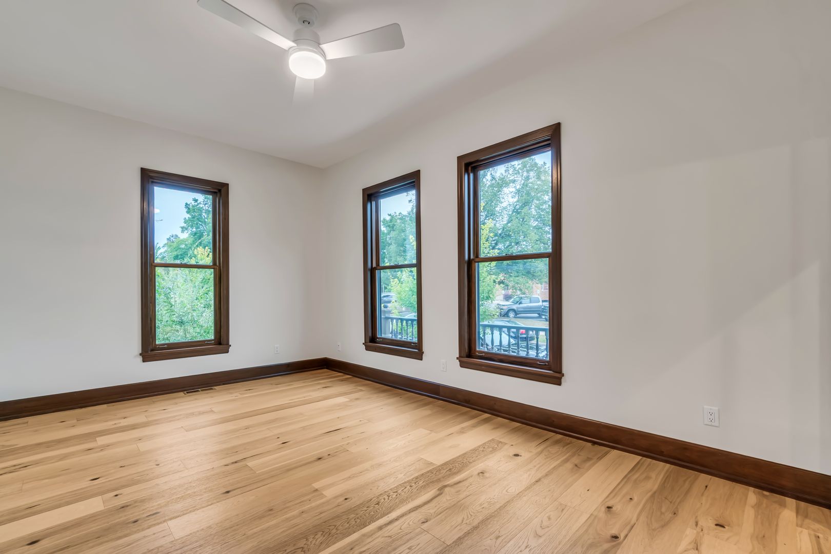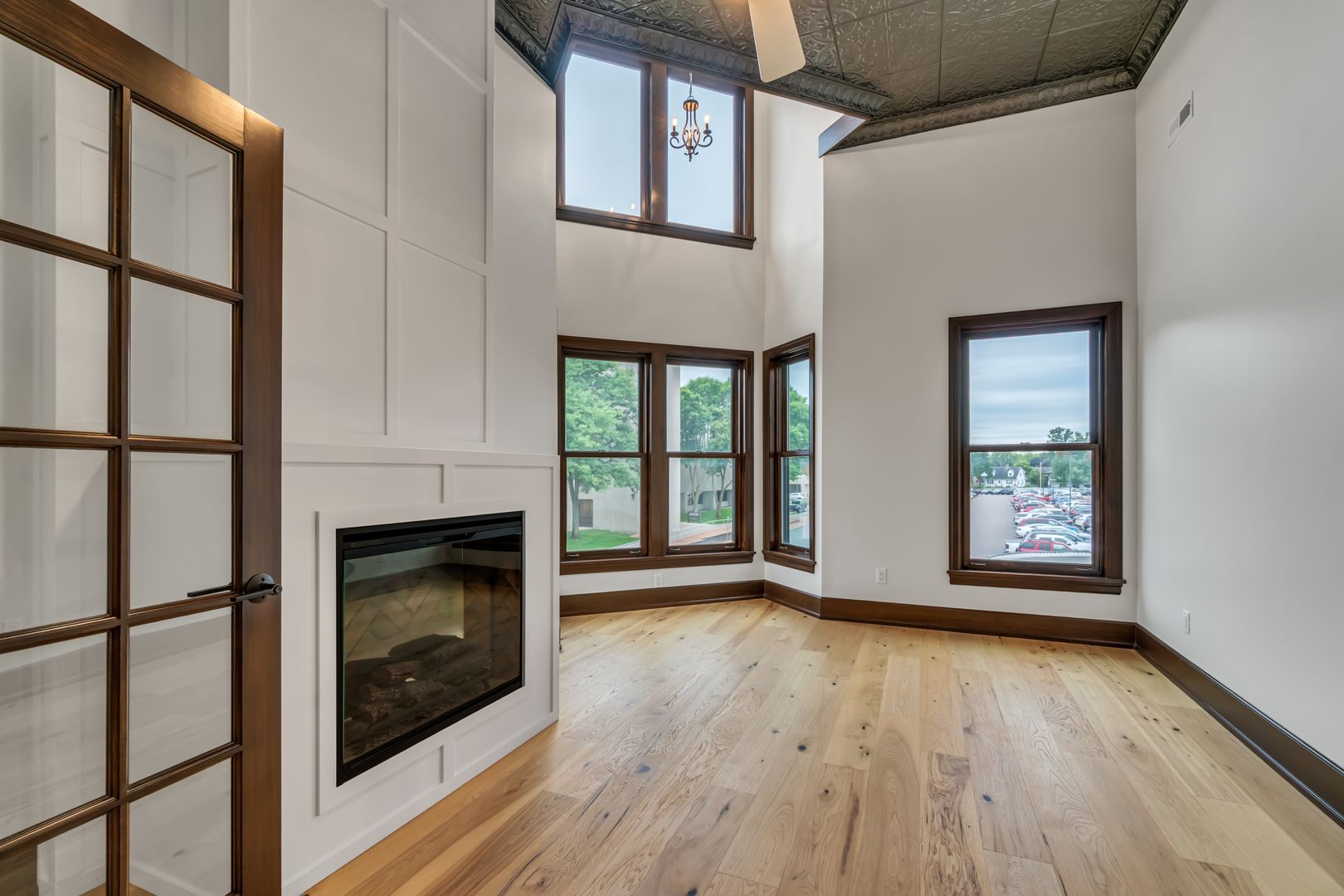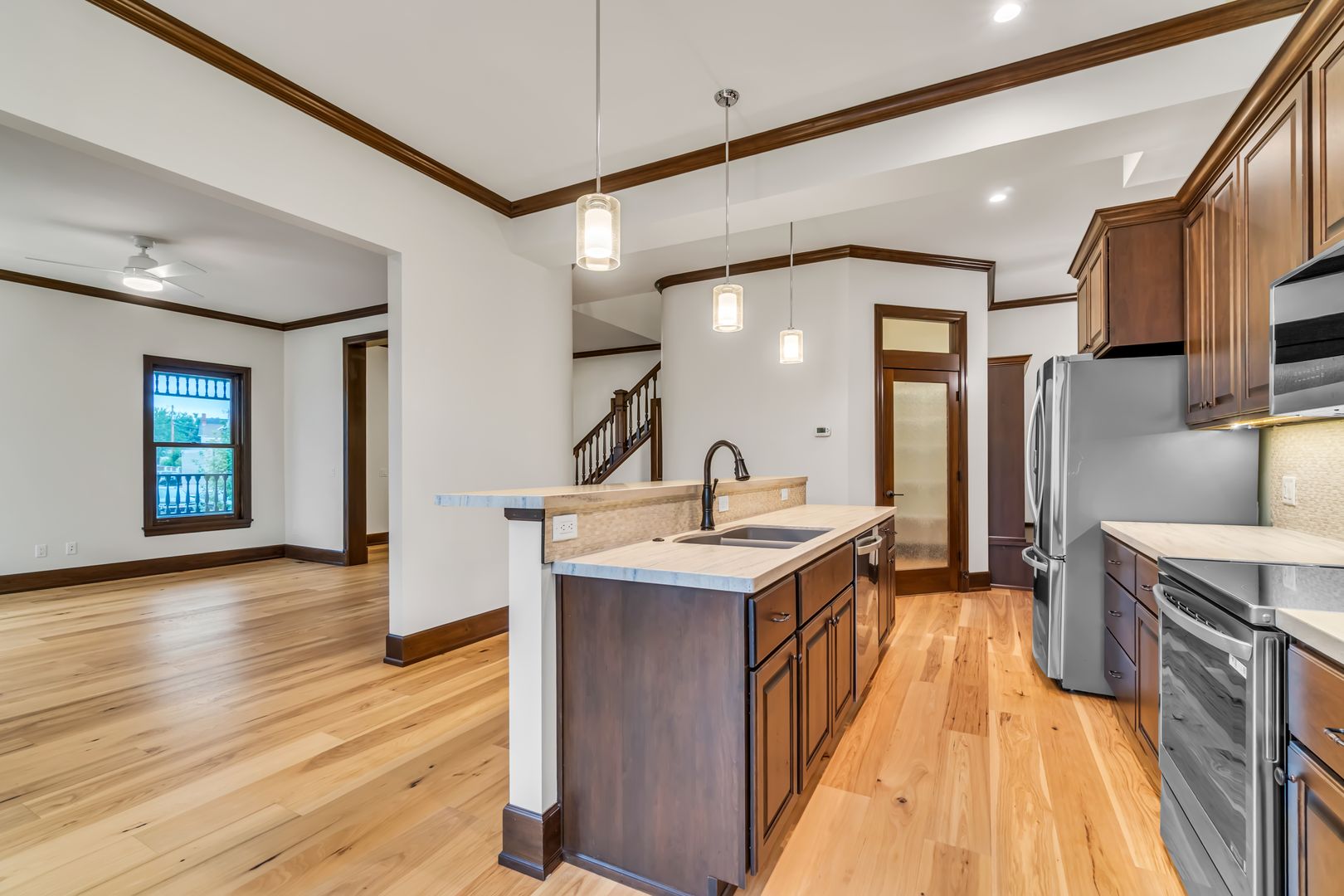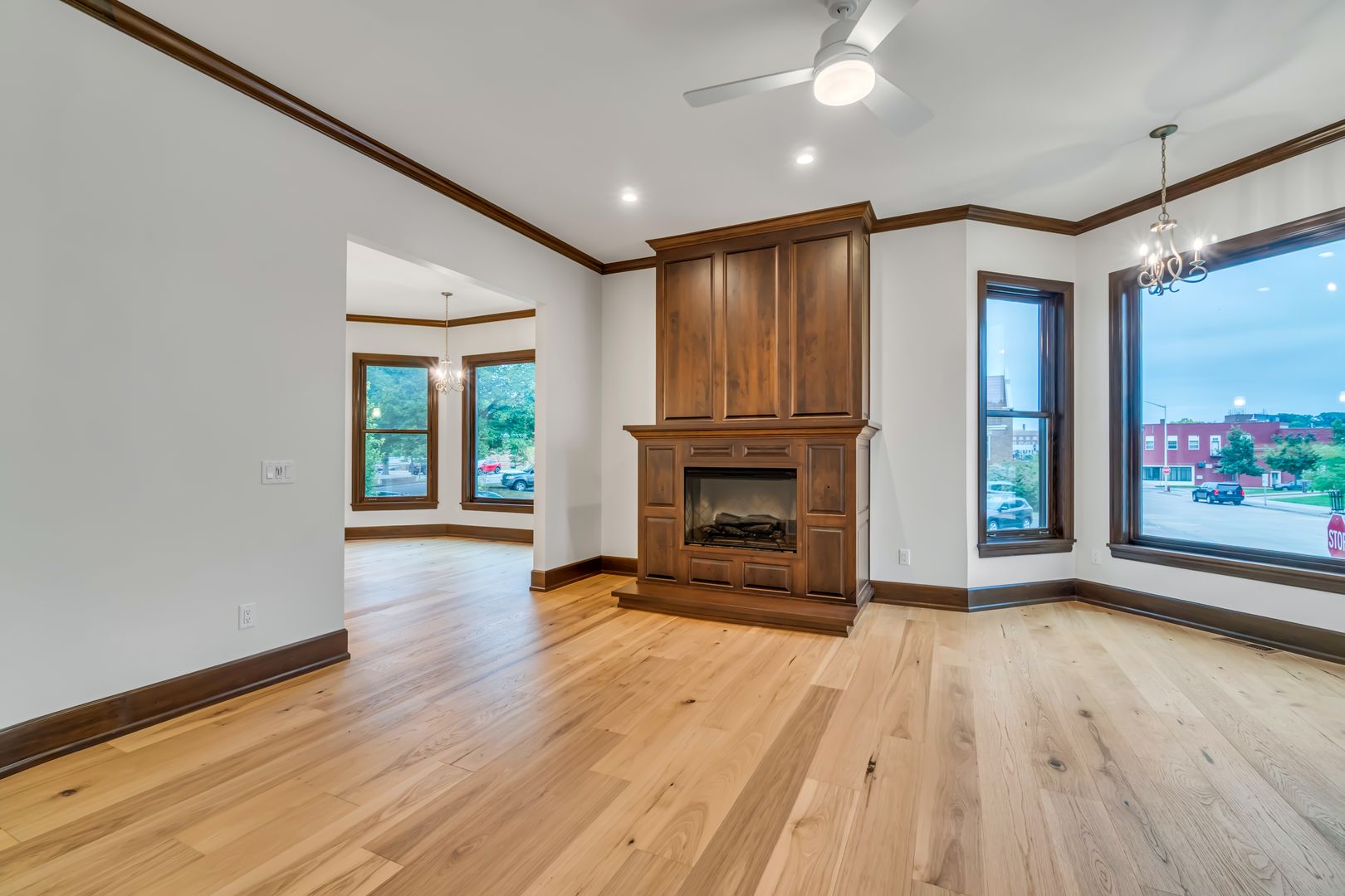 Inside, you'll find a bright, open floor plan that flows from the modern kitchen to the dining area and large living room. A walk-in pantry adds extra storage, and first-floor laundry makes day-to-day living easy. The space is finished with rich hickory flooring and large windows that let in plenty of natural light while offering great views of the downtown area.