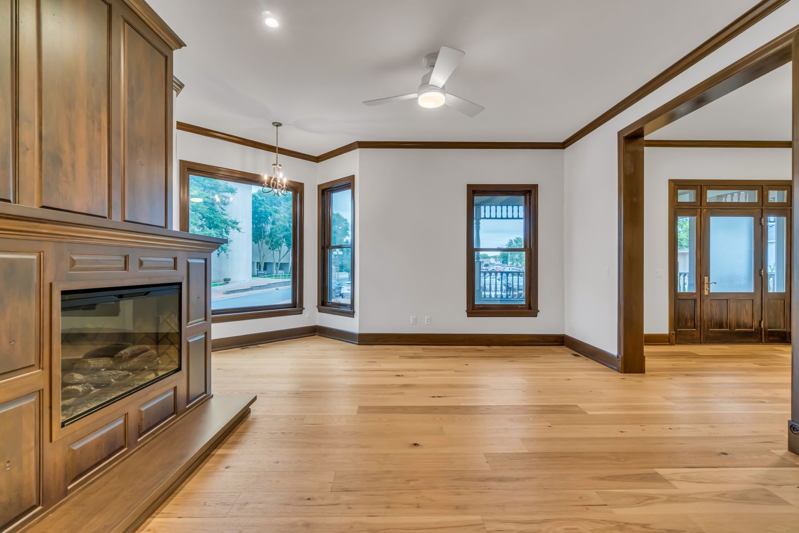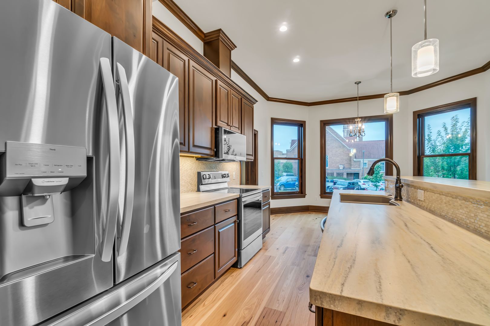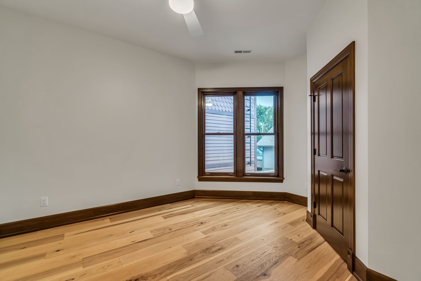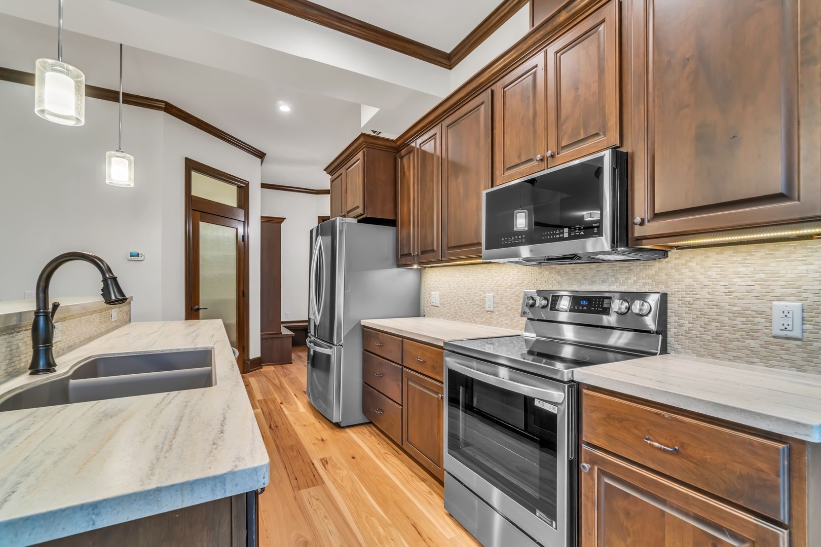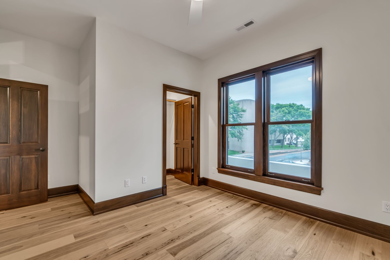 Inside, you'll find a bright, open floor plan that flows from the modern kitchen to the dining area and large living room. A walk-in pantry adds extra storage, and first-floor laundry makes day-to-day living easy. The space is finished with rich hickory flooring and large windows that let in plenty of natural light while offering great views of the downtown area.