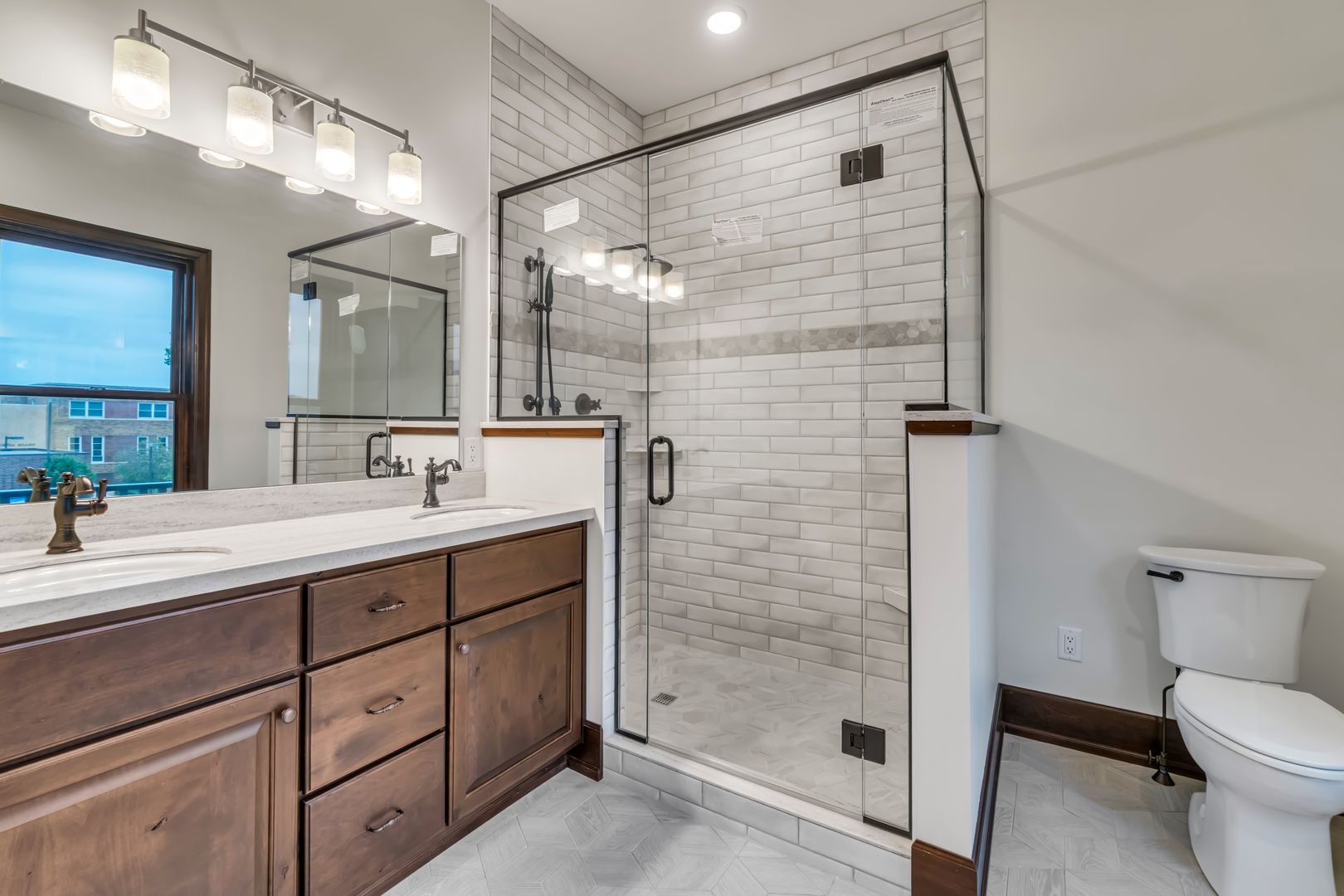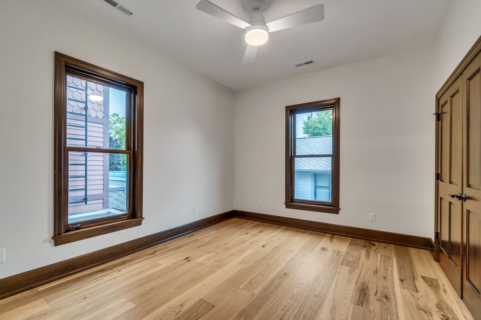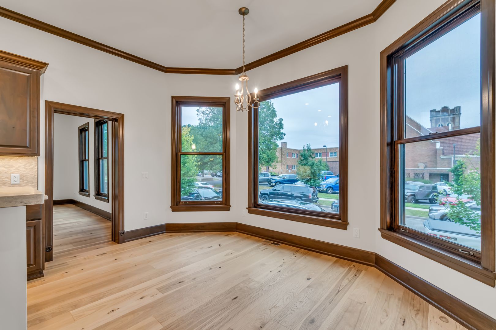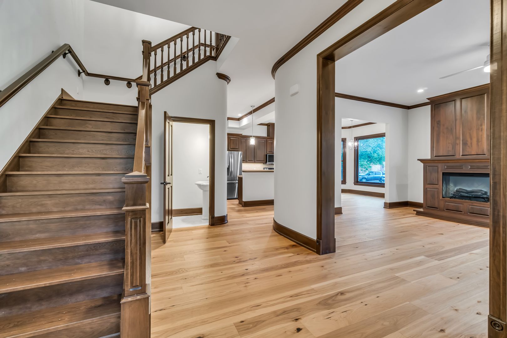 Inside, you'll find a bright, open floor plan that flows from the modern kitchen to the dining area and large living room. A walk-in pantry adds extra storage, and first-floor laundry makes day-to-day living easy. The space is finished with rich hickory flooring and large windows that let in plenty of natural light while offering great views of the downtown area.